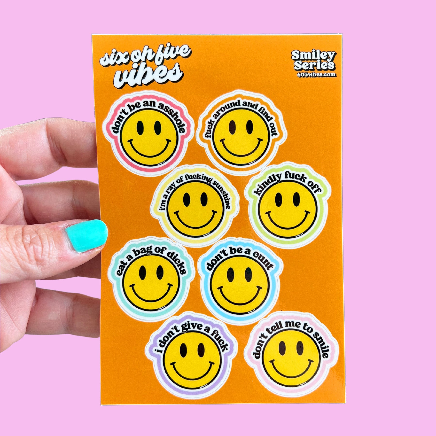 These cute little sticker sheets are 4x6 in size and have bite-sized versions of our Smiley Series designs all on one cute little page! Use these to fill in empty spots on your water bottle, laptop, or make your own custom collage phone case!