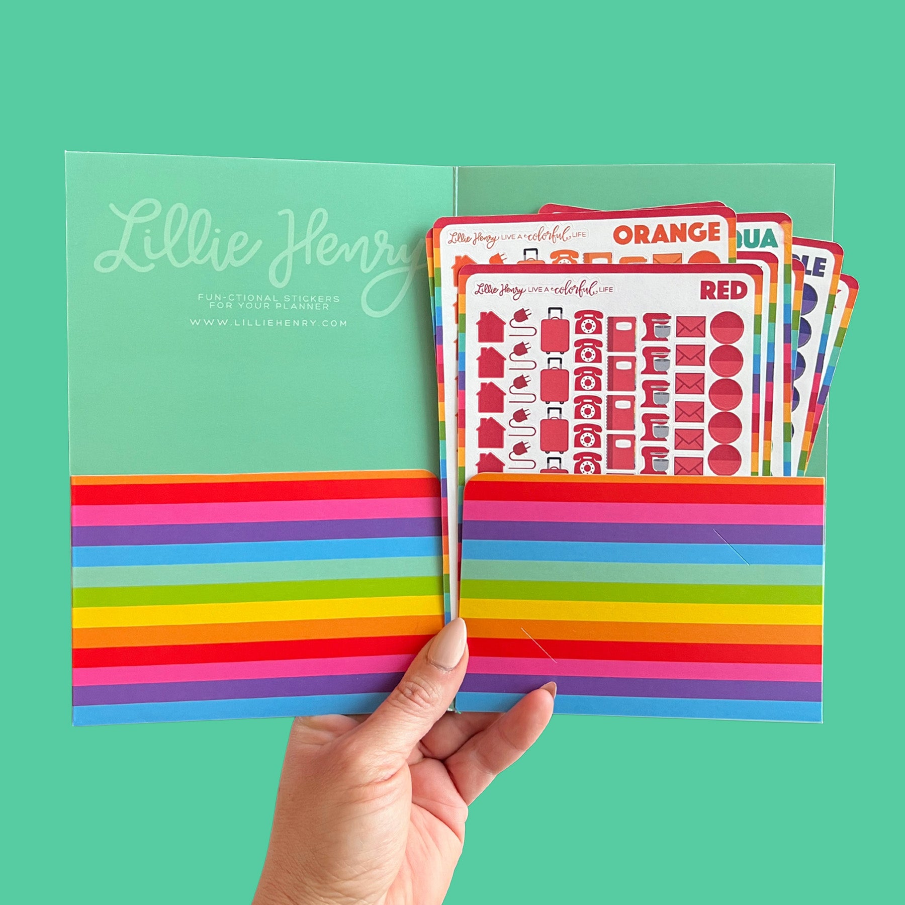 Included in this bundle is a bright, colorful rainbow-striped folder measuring 6”x9”, with two pockets inside. Tucked inside one pocket of the folder is an array of 8 sticker sheets and may include either matte or glossy sticker sheets, one for each color in the rainbow! The stickers are the same on every sheet, and included are some of the most popular Lillie Henry stickers from our shop. Each sheet has a matching rainbow stripe border, exclusive to this bundle! All together, the Life a Colorful Life Bundle has 744 stickers to help you plan your colorful life! The folder is thick and durable, and is the perfect place to tuck your favorite, most-used stickers inside to keep them safe inside your planner or planner pouch!