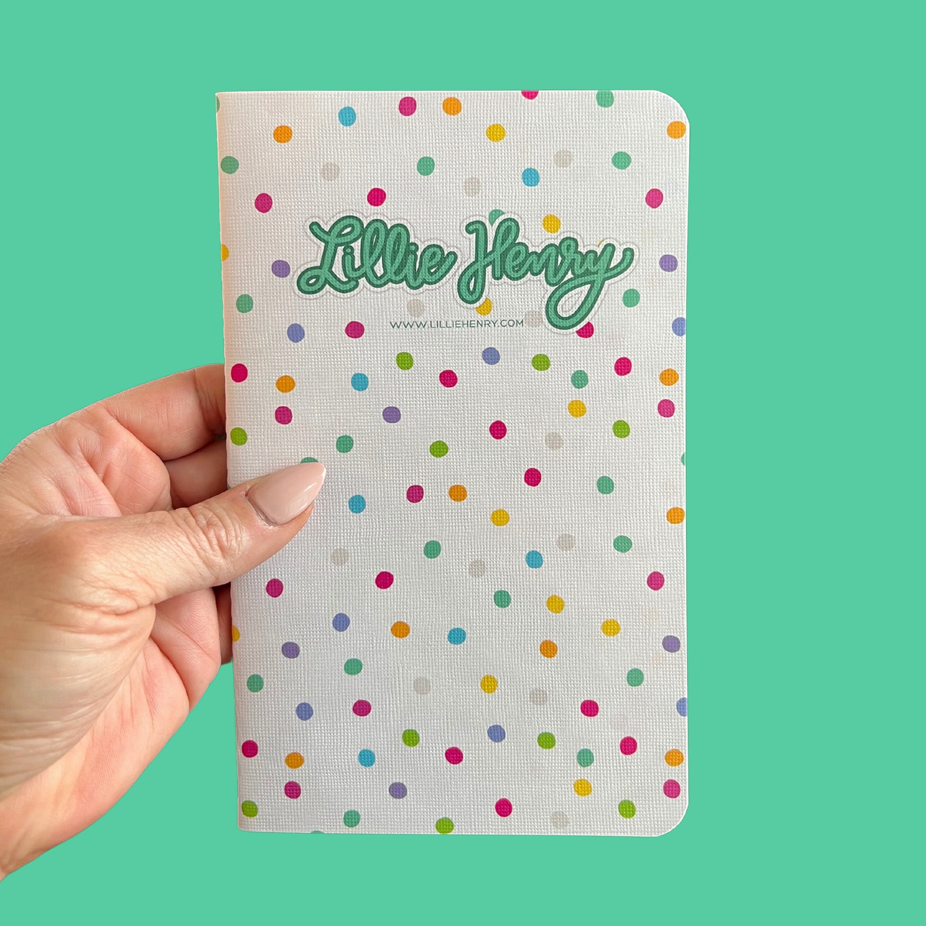 This exclusive Lillie Henry May Designs May Book (www.maydesigns.com) features the Lillie Henry logo on a confetti background with DOT GRID pages. These cute little notebooks are perfect for making lists, sketching, and SO much more!