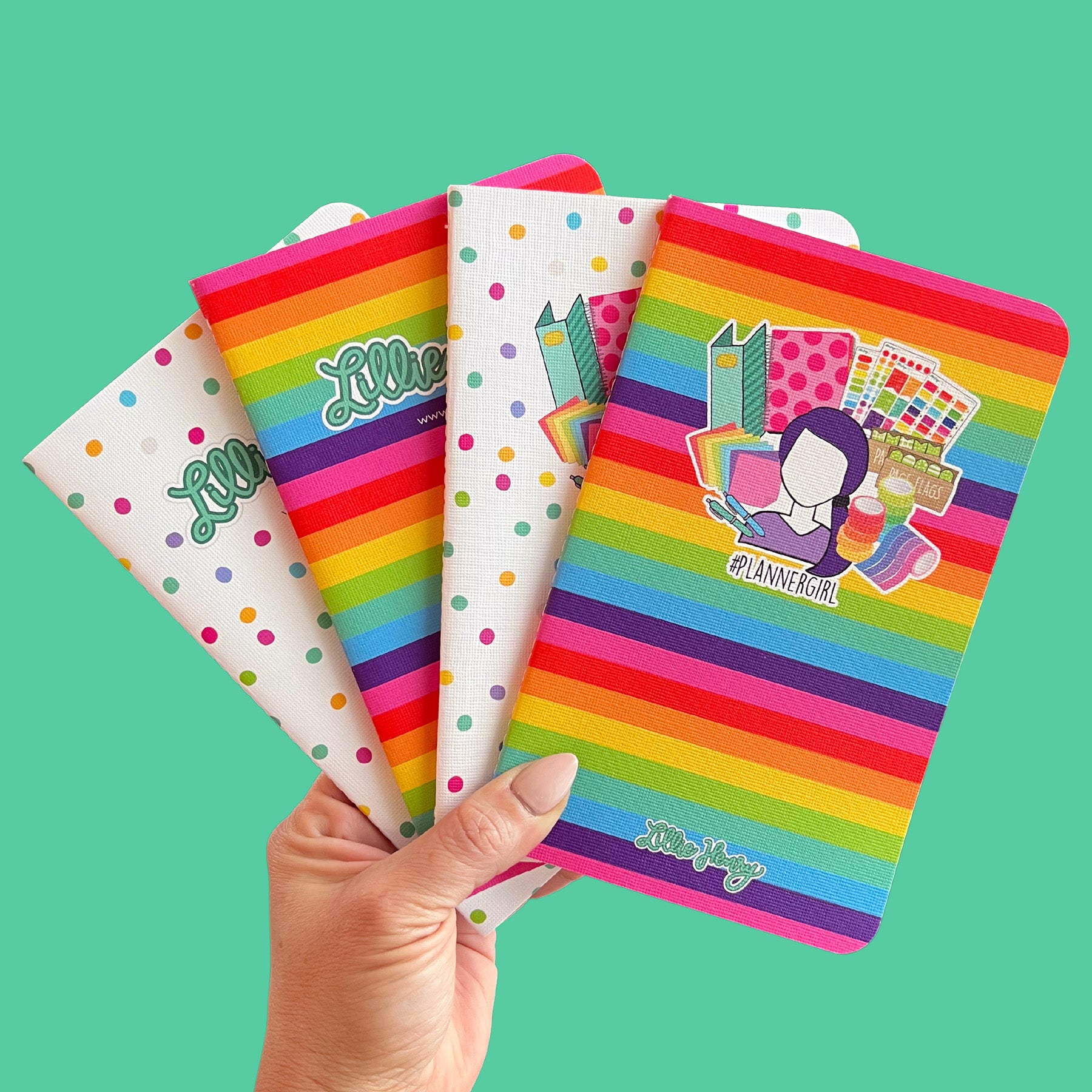 This exclusive Lillie Henry May Designs May Book (www.maydesigns.com) features a hand-drawn #PlannerGirl illustration on a rainbow stripe background with DOT GRID pages. These cute little notebooks are perfect for making lists, sketching, and SO much more!